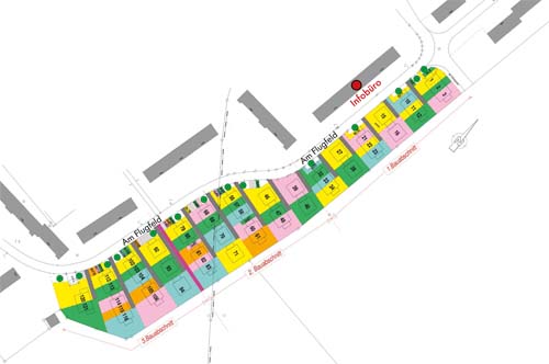 Es werden insgesamt 50 Grundstücke zum Verkauf und zur anschließenden Bebauung angeboten. Dabei sind die Grundstücke in Bauabschnitt 3 bereits komplett verkauft. Derzeit stehen noch einzelne Grundstücke in Bauabschnitt 1 und 2 zur Verfügung. Bauabschnitt 1 bietet insgesamt sechzehn Grundstücke mit Größen zwischen 186 m² und 358 m², Bauabschnitt 2 verfügt über 19 Grundstücke zwischen 183 m² und 368 m². Die vorgesehenen Bebauungsformen sind Einfamilienhäuser, Doppelhäuser und Dreispänner. |